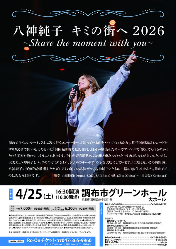 「二度とないこの瞬間」を、八神純子の圧倒的な歌唱力とヤガミグミの迫力ある演奏で、八神純子とともに一緒に過ごしませんか。